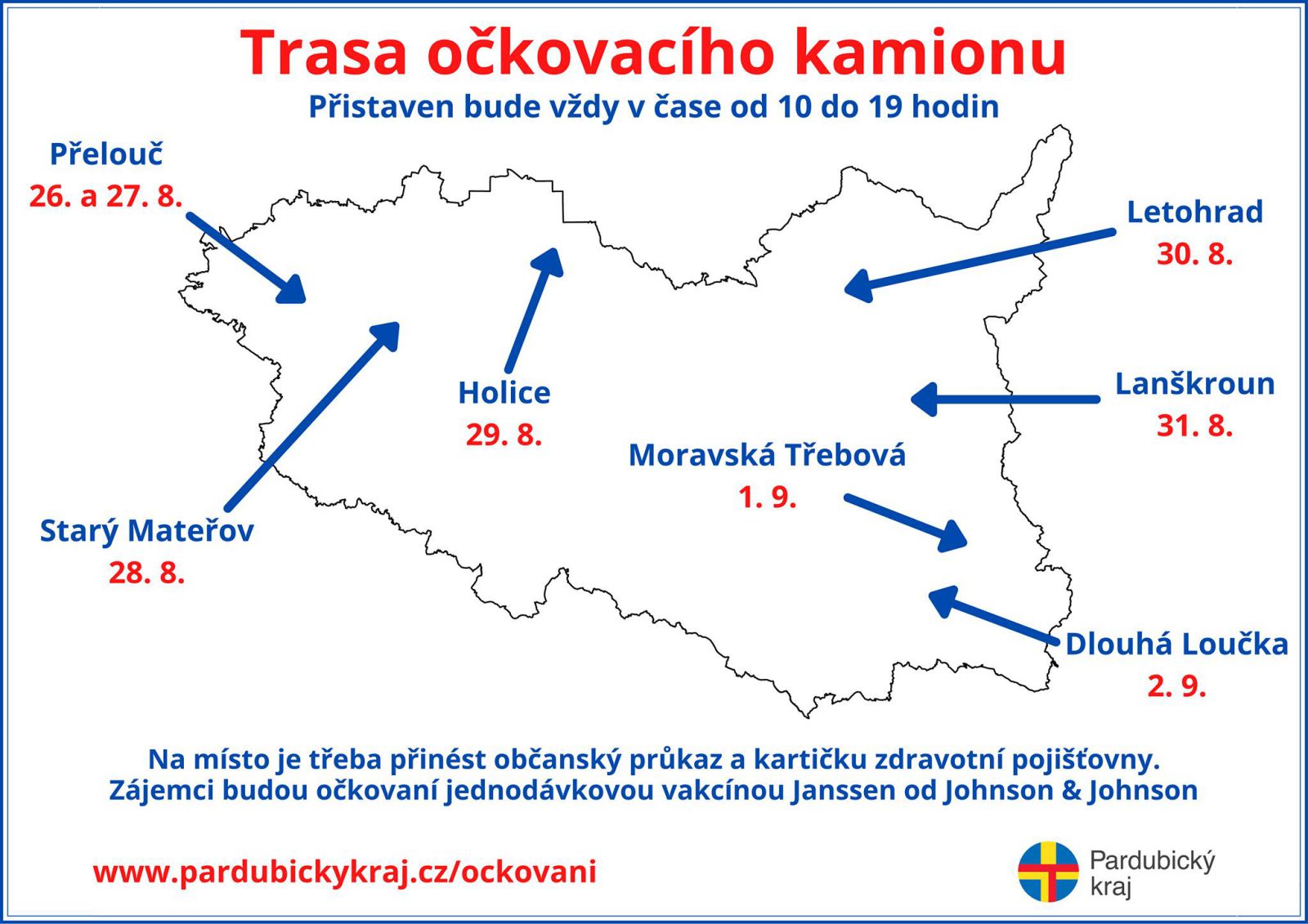 Od 26. srpna až do 2. září 2021 bude po našem kraji opět putovat očkovací kamion. Ten bude kromě doočkování druhé dávky vakcíny Comirnaty nabízet zájemcům bez předchozí registrace také jednodávkovou vakcínu Janssen od společnosti Johnson & Johnson.